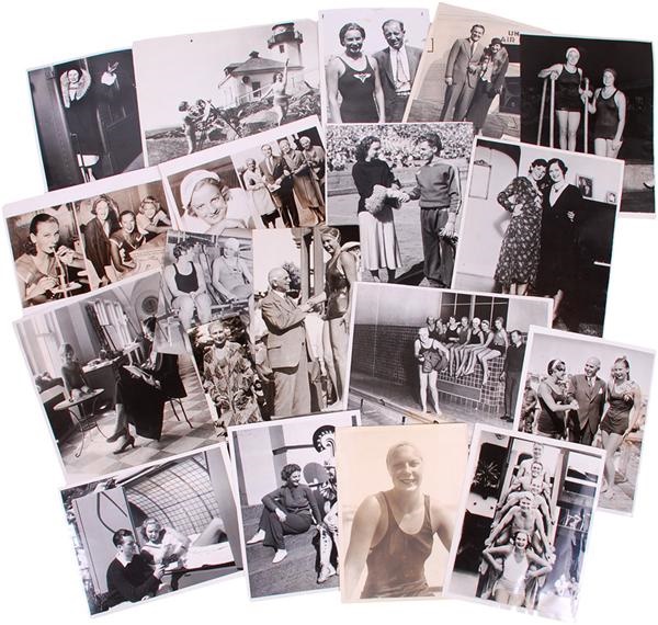 Charming collection of (18) news service photographs from the early 1930s featuring world record breaking swimmer, Helene Madison. The young Seattle native is seen poolside, causing a sensation as she travels around the country winning swim meets, enjoying her hobby as an artist and more. Sized from 6x8 to 8x10, the photos range in condition from VG to MT with many on the better end of that spectrum.