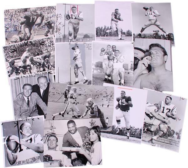 Billy Kilmer photo collection (23) from the 1950's and 1960's. Kilmer played QB for UCLA in college and was inducted into the College Football Hall of Fame. He played a 16 year pro career for the 49ers, Saints, and Redskins. Sizes range from 4” x 7” to 8 1/2” x 11”. They are in VG-NRMT condition. Wire photos include plenty of game action shots with newspaper clippings and captions taped to the back. Many of the photos are family and leisure related including shots in the hospital in 1962 when he broke his leg.