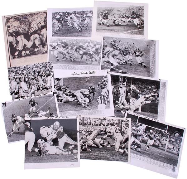 Collection of Baltimore Colts game action photos (22) from the 1950's and 1960's. These are news service photos many with newspaper clippings/captions taped to the back side. Photos range from 7” x 9” to 8” x 10”. Their conditions range from VG-MT with many in the EX-NRMT grades. A few have newspaper edit marks. One photo from 1967 shows Colts QB Johnny Unitas reaching back to pass as Floyd Peters of the Eagles charges the line defended by Alex Sandusky to block his pass. Several photos are of HOFer George Taliaferro in game action shots. Taliaferro was the first black to be drafted by an NFL team.