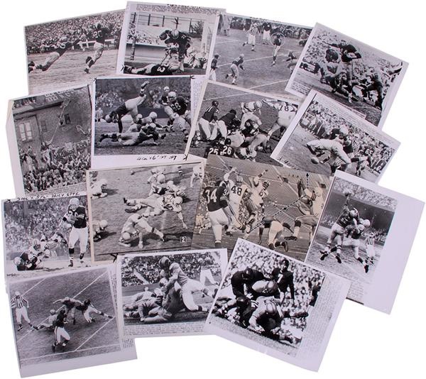 The Green Bay Packers of the 1950's and 1960's are the subject of this collection of football wire photos (45). Photos range in size from 7” x 9” to 8” x 10”. They range is condition from VG-MT with many EX-NRMT. Some have newspaper edits markings. One of the shots from December, 1951 depicts Packer back Rip Collins trying desperately to block a New York Yankees Fleet pass intended for George Taliaferro. Lots of game action shots.