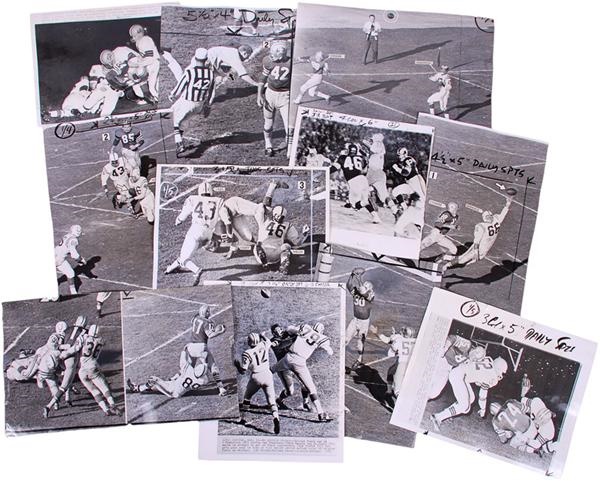 Fine collection of (32) San Francisco 49ers game action football photographs that are mostly the work of the staff photographers of the San Francisco Examiner. Seasons from the early 1960's are the subject with many oversized and diagrammed images. Highlights include an interesting 4 panel photo mock up of a somersaulting 49er giving his all to make the play. Sized from 7x9" to 7.5 x13", the photos range in condition from VG to NM