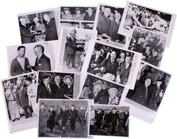 Truman must have been a heck of a sports fan, as evident by these photographs, as he apparently never missed the opportunity to throw out a pitch on opening day or turned down an invitation to attend a college football game. Truman is pictured at the 1944 World Series, 1945 Opening day in Washington, Signing a Football for a U of Wisconsin player, 1949 Opening Day in Washington, getting his 1950 season pass from Ford Frick and Clark Griffith, and more. Most 8 x 10 or slightly larger. EX-MT
