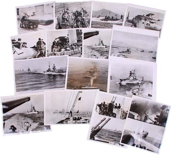 The build up, war time activities and eventual surrender of the Italian naval fleet is the subject of this (48) piece lot of news service photographs from WWII. The 1940's front caption wire photos are in a larger (8x12") format that shows off the war machines well. Smaller, 9x7" images with caption sheets, from what appeared to be a tour of Italy's war ships, show more of a "close up and personal" perspective of the Italian navy's might. The quality is great here with some VG but more in the EX to MT range.