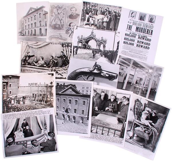 An interesting collection of vintage images relating to the assassination of President Abraham Lincoln. The (30) news service and wire photos date from the 20's to the 60's. Included: an excellent quality news service photo of the Ford Theater with the original caption sheet dated 1922; A stunning 1952 reprint of Lincoln's open-casket viewing; a very early, NM reprint of the official government photograph of the Booth hanging. Sized from 5x7 to 8x10, the images range in condition from VG to MT.