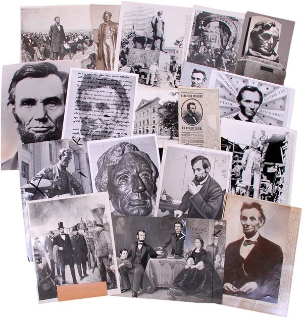 Remarkable collection of Abraham Lincoln photos (150+). Lincoln was the sixteenth President of the United States, serving from March 4, 1861 until his death on April 15, 1865. He issued the emancipation proclamation in 1863 and promoted the passage of the thirteenth amendment prohibiting slavery. Photos range in size from 3” x 6” to 8 1/2” x 13”. They are in a range of conditions from FR-MT with many showing newspaper edit markings. Collection includes a wide diversity of photos including many of his wife, Mary Todd, and of the rest of his family including his son Robert T. Lincoln, who was his only child of 4 to survive into adulthood. One rare photo, taken in Chicago in 1858, was found by a retired Ohio fireman in 1947. It is a beardless portrait of Lincoln. There are also many photos of written speeches and documents Lincoln wrote and made famous. This is an exceptional collection of photo americana.