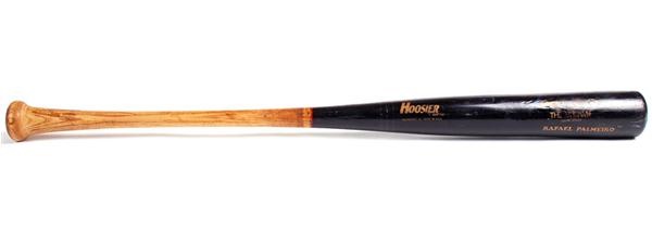 34" Hoosier Bat Co. baseball bat game used by veteran slugger Rafael Palmeiro. Palmeiro's name is gold foil stamped on the barrel and his number 25 is written on the knob-end. Dark stained bat shows the blue American League ball marks well and several are visible along the barrel.
