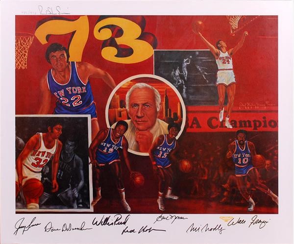 The NBA champion, 1973 New York Knicks, inspired this 1990 work by artist Robert Steven Simon. The limited edition lithograph (484/1973) has been signed by the artist and (7) members of the championship team including: Coach Red Holzman, Willis Reed, Walt Frazier, Dave Debusschere, Jerry Lucas, Earl Monroe and Bill Bradley. Mint.