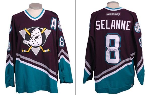 Teemu Selanne holds several franchise scoring records with the Anaheim Ducks. This Mighty Ducks of Anaheim away jersey (Koho size 54) was game used and signed by Selanne in 2001. Shows good use with many patched-repairs and altered cuffs. Selanne has signed the number 8 on the back in mint black Sharpie.