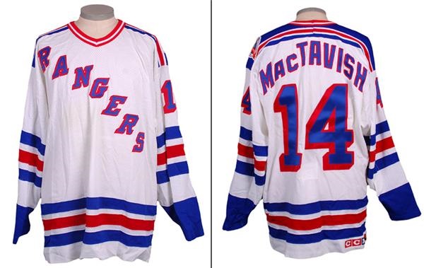 Craig MacTavish played center for the NY Rangers during their 1993-94 Stanley Cup season. MacTavish wore this home jersey (CCM size 54) during the finals. It has the 1994 Stanley Cup Championship patch on the left shoulder and shows light use.