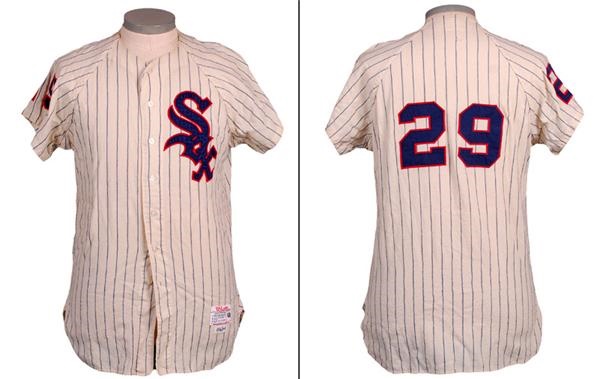 Chicago White Sox pitcher Frank Kreutzer played for the Sox during the 1962, 1963 and part of the1964 seasons before being traded to the Washington Senators. In both the '63 and 64 seasons the ChiSox finished second in the AL to the NY Yankees. This Wilson flannel jersey is a size 40 and is game used. No name on the back, however Kreutze's name is stitched into the collar label and his #29 is stitched on the right shoulder sleeve as well as the back of the jersey.