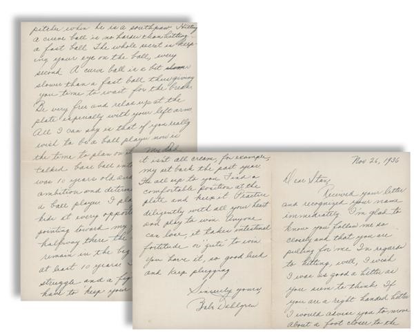 Letter written by Babe Dahlgren to a fan named Stan in November, 1936 when he was still a member of The Red Sox. Dahlgren would soon join the NY Yankees to replace the great Lou Gehrig at first base. The Dahlgren handwritten letter is penned in black ink on a 5 1/2" x 8" folding card. It is in NRMT condition with just the original mail folds visible. In it Babe gives batting advice to Stan the fan who has obviously solicited it in a previous letter. Comes with a COA from PSA/DNA.