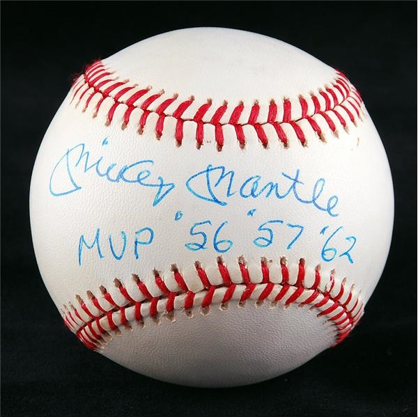 Official American League (Brown) baseball signed by Yankee legend Mickey Mantle with the inscription, "MVP '56 '57 '62". Mint signature in blue ball point on a ball with very light toning on side panels. Comes with an LOA and sticker from PSA/DNA.