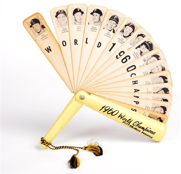 Cool baseball bat shaped fold out fan from the 1960 World Champion Pittsburgh Pirates. Bat is 10" with yellow and black tassled string dangling off the handle. Fans out into 15 2-sided pages each listing a player or coach with their photo and position/title. Pages are slightly yellowed but in EX condition with no rips or tears. World champion players featured include Catcher Hal Smith, Infielders Don Hauk, Dick Groat and Bill Mazeroski as well as outfielder Roberto Clemente.