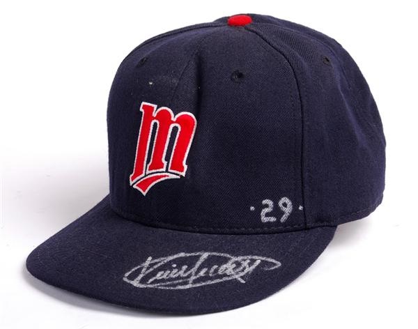 During spring training 1996, Kirby Puckett was taking care of business in the Grapefruit League when glaucoma suddenly took vision from his right eye and Puckett out of baseball. Here is a Kirby Puckett signed and game used Twins baseball cap from that abbreviated season. The New Era 59/50 pro model cap has Pucketts "#34" under the bill and has been signed in NM silver paint pen and numbered "29". Comes with a Twins team LOA. Fine memento of a great HOFer lost to us in 2006.