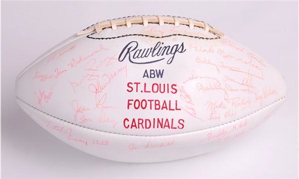 Fantastic 1960's St Louis Cardinals team signed football with 31 signatures. This white, Rawlings ABW football is stamped "St. Louis Football Cardinals". The players have signed in 8/9 red ball point and include: John Crow, Jimmy Hill, Bill Koman, Sonny Randle, Larry Wilson, Bill Stacy, Joe Childress and more. Comes with an LOA signed by then Cardinals running back, Frank Mestnik.