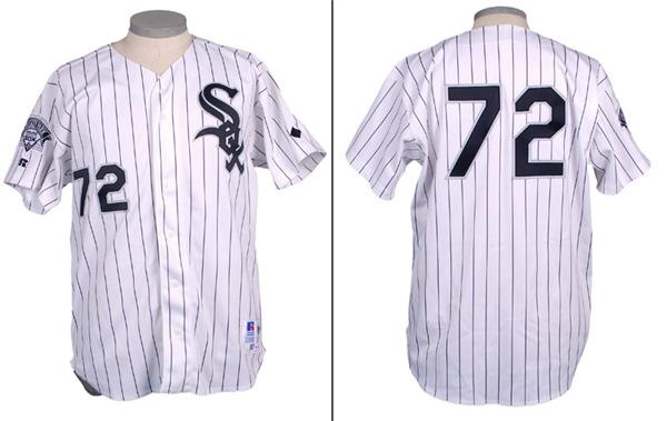 A game used baseball jersey from one of HOF catcher Carlton Fisk's, last major league seasons. This 1992 Chicago White Sox jersey, in Fisk's retired number 72, is from the Russell Athletic Diamond Collection (SZ 48) and has the date tag on the shirt hem and a Comiskey Park patch on the right sleeve. It shows light use with dirt on the collar and sleeves.