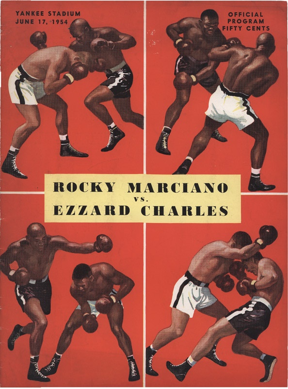 Official program book for the June 17, 1954 fight between Ezzard Charles and Rocky Marciano. Program book is 9" x 12" and 32 pages including cover. It is in EX-MT overall with only a 1/8" tear on the spine and minor creasing and scuffs on the cover. Inside pages are NRMT. Rocky Marciano retained his World Heavyweight title with an 8th round knockout of Ezzard Charles. This event took place at Yankee Stadium in front of almost 50,000 fans. Marciano was a 7 to 2 favorite going in.