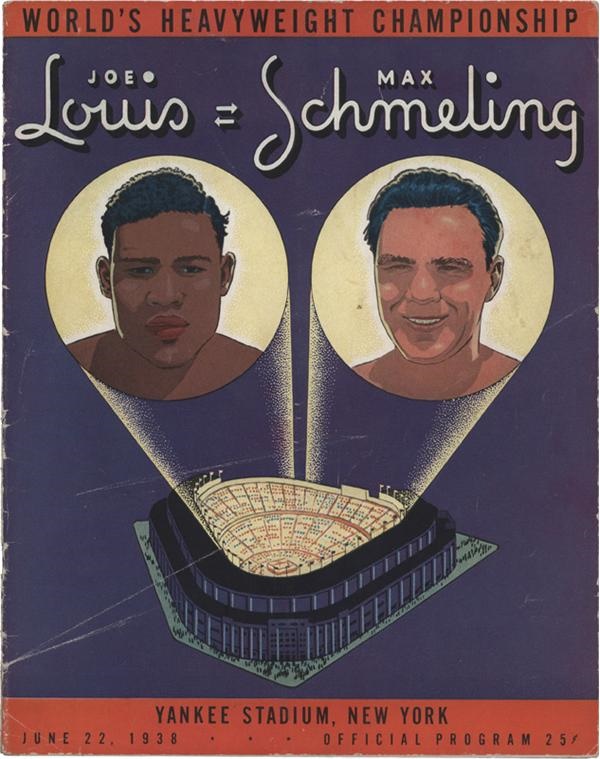 Official program book for the June 22, 1938 rematch between Max Schmeling and Joe Louis. This fight was not only a rematch of heavyweight fighters, but also the rematch of a propaganda battle between two heavyweight nations; America and Nazi Germany. Program book is 8 1/2" x 11" and 24 pages including cover. It is in VG-EX overall with some scuffing and creases on the spine and cover. There is some clear tape on the inside front and back covers and on an inside page as well. The rematch took place like the first match at a capacity filled Yankee Stadium. The world listened in on their radios as the fight was not televised. Louis knocked Schmeling down twice in the 1st round before ultimately knocking him out for good with the third knockdown two minutes into the bout. Hitler was so disgraced that when Schmeling returned to Germany Hitler forced him to become a member of the German Army by volunteering him for paratrooper duty.