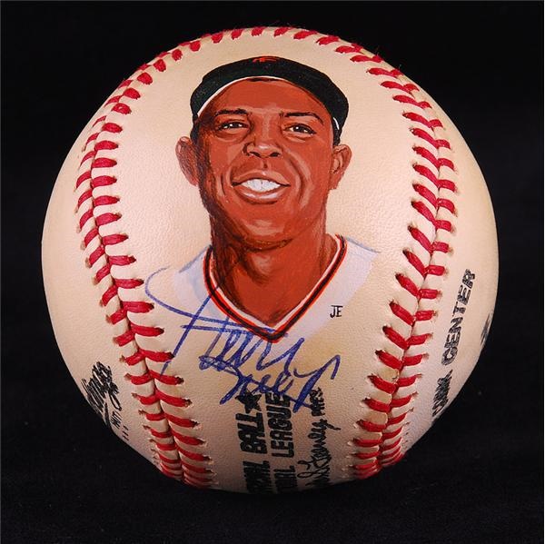 Official National League (Feeney) baseball signed by the legendary Willie Mays. This is a wonderful quality portrait ball, very lightly toned, with Mays' signature in mint blue ball point just under his painted image. Comes with a COA and sticker from JSA.