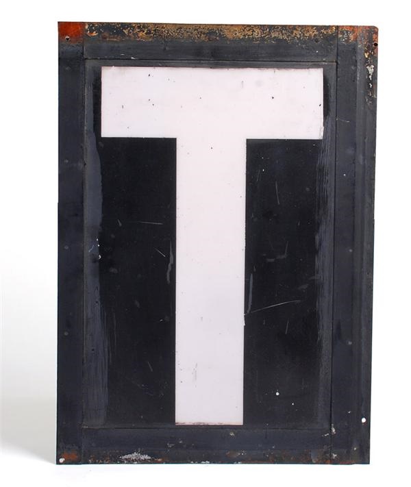 This vintage, metal-framed scoreboard letter "T" is a relic from one of the classic parks of baseball, Yankee Stadium. The letter measures 16" x 22" and is white on a black background. It was used prior to stadium renovations in 1974. Comes with an LOA from Lelands' own Mike Heffner guaranteeing its origins.