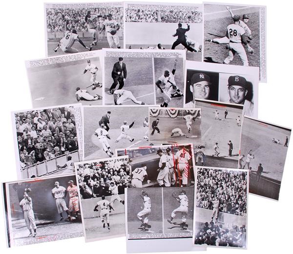 Great collection of Dodger World Series news service wire photos (34). The Dodgers were participants and winners of many series games both when based in Brooklyn and Los Angeles. Photos cover "dem bums" during six World Series starting in the (8) 1952 World Series, as well as (2) 1955, (5) 1956, (16) 1965, (2) 1966, and (1) 1974. Sizes range from 6" x 9" to 8" x 10" and are in varying conditions from VG-MT with most EX-MT. The mantra for the Dodgers had always been "wait 'til next year", that is until 1955 when they finally saw next year occur in dramatic fashion by defeating the hated Yankees in seven games.