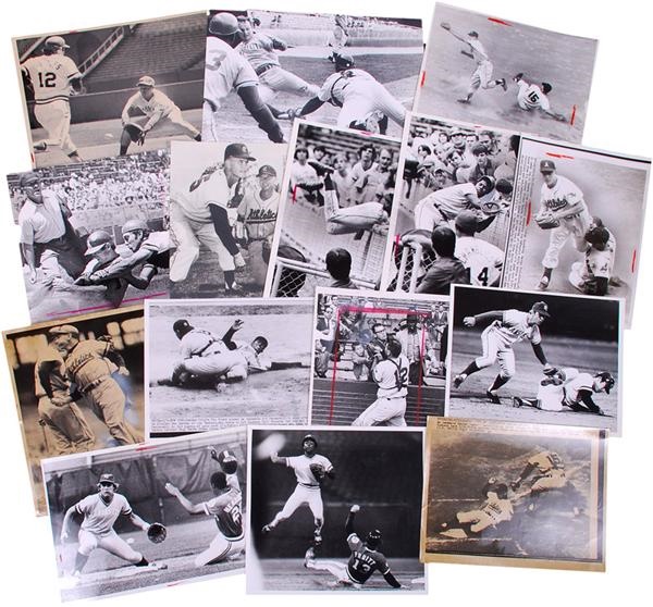 Collection of Kansas City A's and Royals newspaper photos (59) from the 1950's through the 1970's. Lots of game action shots. Includes players such as George Brett, John Mayberry, Art Ditmar, Fred Patek, Frank White, Greg Nettles, Al Cowens, Bill Tuttle and Lou Boudreau. They range in size from 7" x 9" to 8" x10" and in condition from VG to MT with many EX-MT. There is a great shot of "Sweet Lou" Piniella tossing his helmet in disgust after being struck out by one of Gaylord Perry's "wet ones". And another of Bill Tuttle making a spectacular backhand catch at Yankee Stadium in 1959 in front of Lou Gehrig's memorial plaque at Monument Park.