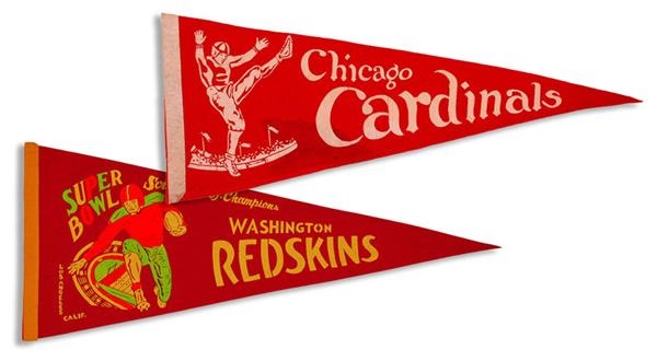 Vintage Chicago Cardinals and Mint Washington Redskins pennants.