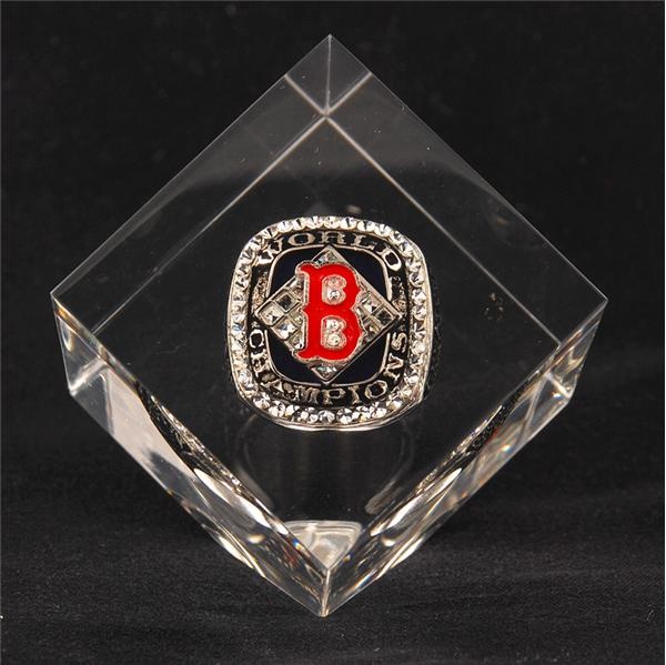 Baseball display piece created to commemorate the long-overdue 2004 World Series victory of the Boston Red Sox. Reproductions of the Red Sox World Series ring were captured in a 2 x 2 x 2" Lucite cube to be presented to VIP's in the organization. Some of the pieces that were made showed imperfections in the ring surfaces and stone settings and therefore were considered seconds and never given out. A few made it into the market, including this one. Great opportunity to own an (almost) perfect memento of the greatest comeback in baseball history!