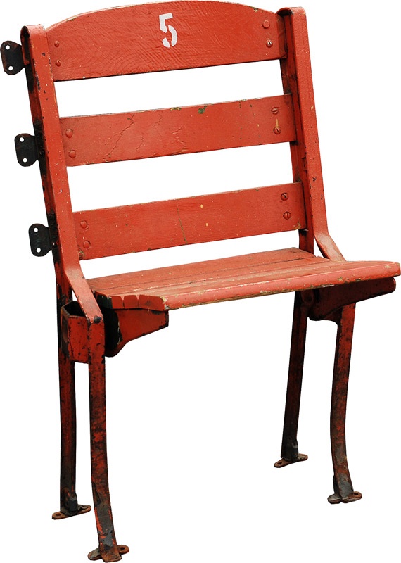 Cast Iron and wood stadium seat with the original orange paint and stenciled #5 (Dit Clapper's retired number). No broken pieces or cracked slats. Some minor rusting and scratches on the sides typical of stadium seats that were used for many years.