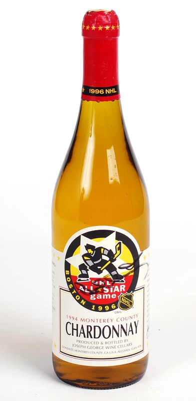 One normally equates beer, not chardonnay, with hockey. Nonetheless, here is a custom labeled 1994 Monterey County chardonnay bottle(647/6000) commemorating the 1996 NHL All-Star game in Boston. The label is 8/9 signed by hockey's preeminent defenseman, HOFer Bobby Orr.