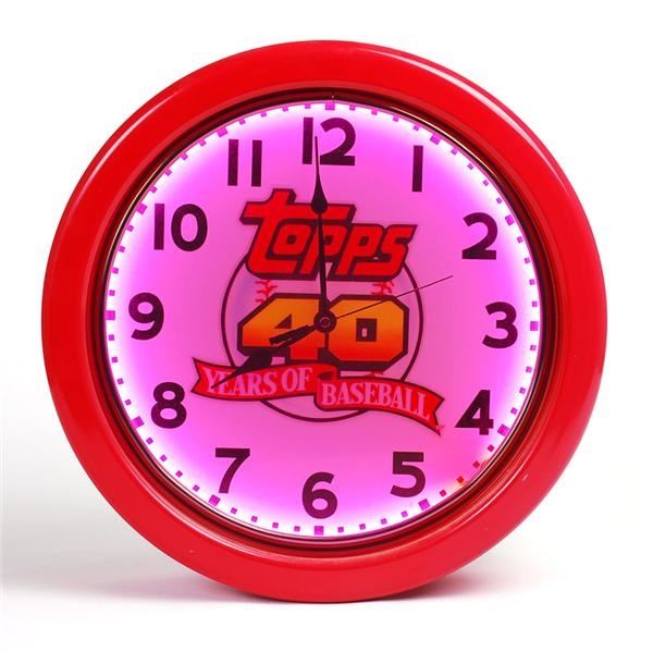 To celebrate 40 years of baseball memorabilia from Topps, a limited edition neon clock was designed by West Coast Custom Designs in 1992. This 16" round clock has a red housing with a white face emblazoned with the Topps 40th anniversary logo. The clock is in unused condition in its original box. Comes with a COA which lists the clock as #1480 of 2500. Original care instructions also included.