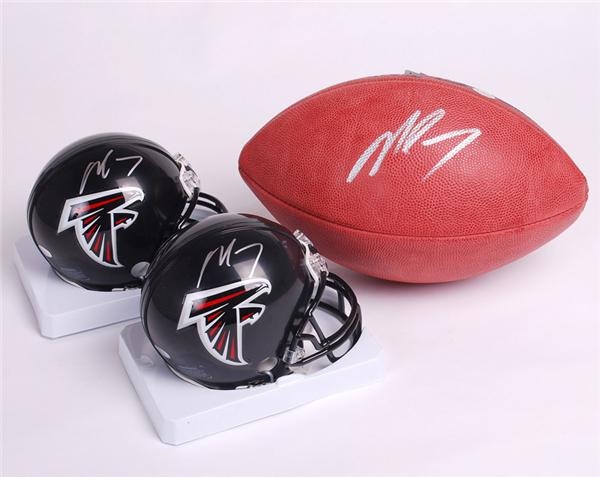 Embroiled Atlanta Falcons QB, Michael Vick, has signed (2) mini helmets and a football in this NFL lot. Includes: * (2) Riddell mini-helmets signed in mint silver ink by Vick and accompanied by a PSA/DNA LOA. * Official NFL (Tagliabue) football mint signed in silver ink by Vick w/ Vick hologram sticker.