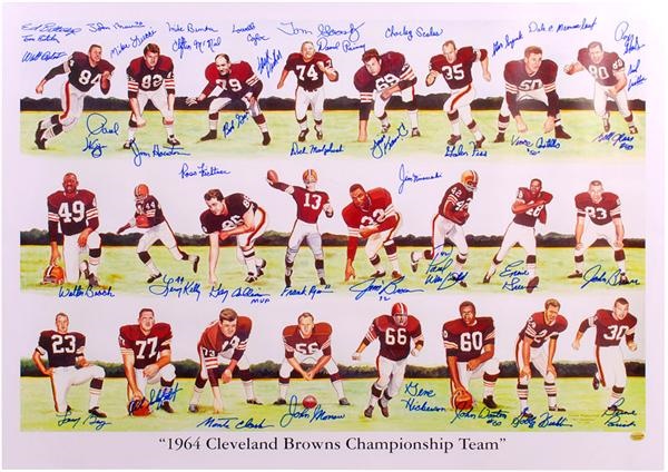 The 1964 NFL Champion Cleveland Browns are the subject of this limited edition lithograph by Jim Fiorentino signed by 24 players from that great team. Signatures include: Jim Brown, Frank Ryan, Gary Collins (MVP), Paul Warfield, Leroy Kelly, Ernie Green, Johnny Brewer, Walter Beach, Larry Benz, Monte Clark, Vince Costello, Galen Fiss, Bobby Franklin, Bob Gain, Bill Glass, Gene Hickerson, Jim Houston, Jim Kanicki, Dick Modzelewski, John Morrow, Bernie Parrish, Dick Schafrath, Paul Wiggin, and John Wotten. Measures 30 x 40".
