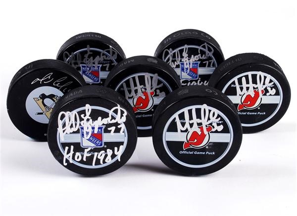 Three of NHL hockey's biggest stars have signed this super collection of (7) pucks. Included: (3) official NHL Ranger logo game pucks signed by Phil Esposito in mint silver paint pen with the inscription, "77" & "HOF 1984" (each with STEINER hologram sticker and COA card); official NHL current Devils logo game pucks signed by Martin Brodeur in mint silver paint pen with the inscription, "30" (each with STEINER hologram sticker and COA card); NHL licensed Penguin logo puck signed by Mario Lemieux in mint silver paint pen with the inscription, "66".