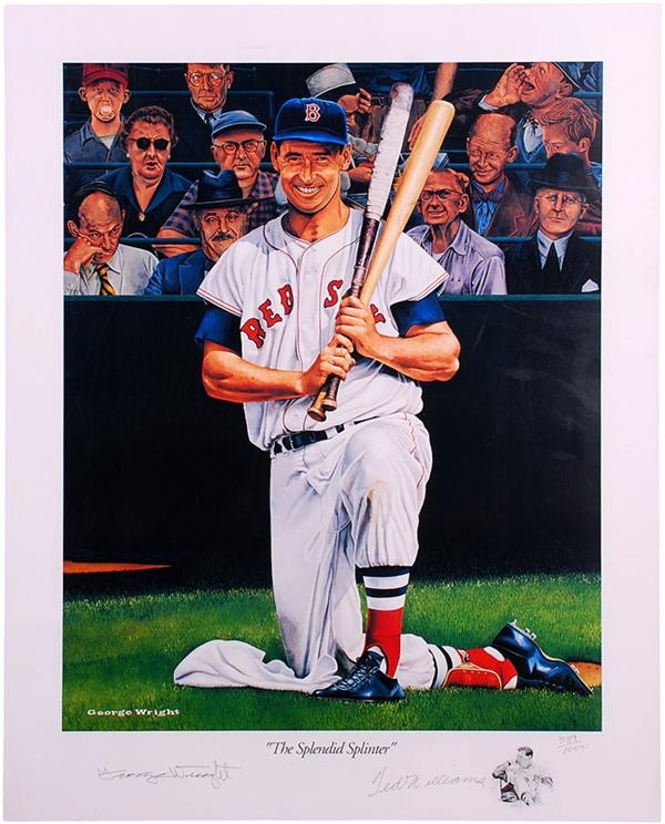 Beautiful lithograph entitled "The Splendid Splinter" by George Wright. This great image of Ted Williams, kneeling with bats on shoulder, has been signed by both William and the artist in mint pencil. It is a limited edition 389 of 1000. Measuring 22 x 27.5", the lithograph comes with a COA from Ted Williams Family Enterprises, Ltd.