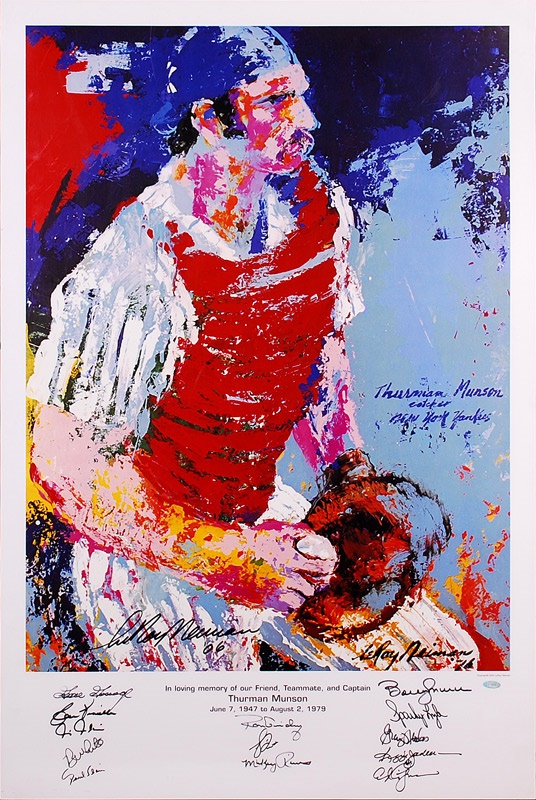 This beautiful print was created in memory of Yankees catcher and captain Thurman Munson. It has been signed by artist Le Roy Neiman and 13 of his teammates including: Goose Gossard, Lou Piniella, Sparky Lyle, Graig Nettles, Reggie Jackson, Bobby Murcer, Ron Guidry, Mickey Rivers and others. Poster measures 26 x 39" and comes with a STEINER hologram sticker affixed at the bottom.