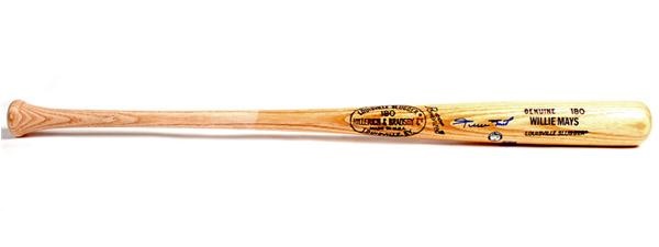 34' H&B 180 Willie Mays model baseball bat mint signed by the prolific hitter in blue Sharpie. Comes affixed with a "Say Hey" Mays hologram sticker. Perfect bat.