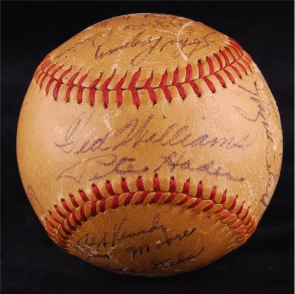 Ted Williams has signed this Official National League (Frick) ball on the sweet spot. The Splendid Splinter's signature is an 8-9. Made by Spalding, the ball is marked USN and is vintage WWII era. It is also signed by Ted Lyons and Bob Lemon, both HOFers, as well as 14 others. Ball is evenly toned with some minor scuff marks and red stitching.