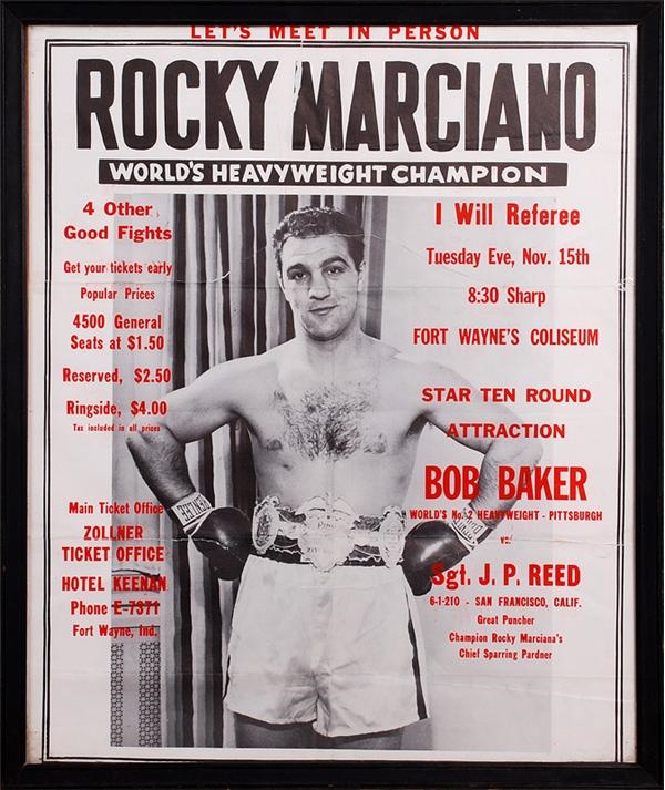 Rocky Marciano stares out from this vintage fight poster and invites the reader, "Let's meet in person". The boxing heavyweight champ was promoting a bout, that he would referee, between his sparring "pardner" JP Reed and Bob Baker in Fort Wayne, Indiana. The framed poster measures 18"x 21" and appears in G/VG condition. The original folds are visible and there are three major tears that have been repaired. Regardless, the poster looks great mounted behind the glass, safe from any further damage. The graphics are crisp and the photo of Marciano, with a crooked not-quite smile, is priceless.
