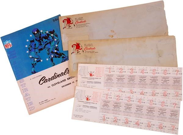 Collection of HOFer Jim Brown's last game memorabilia. Brown played running back for Syracuse in college and then the Cleveland Browns in the NFL. He is regarded as one the best, if not the best running back of all time. He has also been voted the number one football player of all time by the Sporting News. The collection includes the program book from his last game versus the St. Louis Cardinals (SL Version) on December 19, 1965. It also includes two complete sets of unused and un perforated Cardinals seasons tickets which include tickets for Brown's last game against the Cardinals. They come with the original postmarked Cardinals logo envelopes.