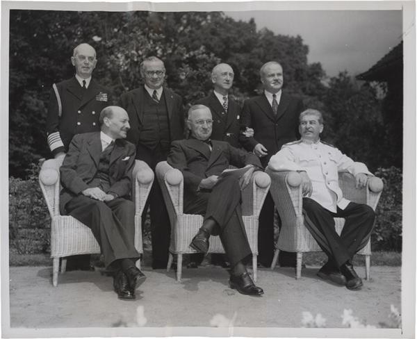 The final Big Three leaders meeting taking place at Potsdam in a defeated Germany in 1945 is the subject of this (1945) wire photo. Photo is 8" x 10" and is in EX/NRMT condition with only a few minor waves in the paper. This was President Harry Truman's first and only Big Three meeting. It was the same for newly elected British Prime Minister Clement Attlee who replaced Winston Churchill after he was swept out of office in 1945 elections. Only Josef Stalin remains of the original Big Three of Roosevelt, Churchill and Stalin.