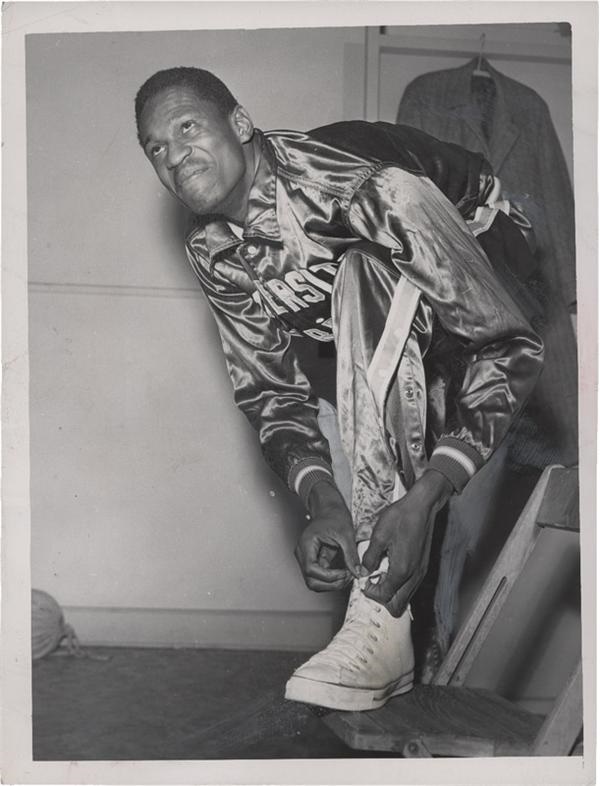 Photo of USF and Boston Celtic basketball great Bill Russell "lacing 'em up" before a big game for USF in 1955. Photo is 7" x 9" and in EX condition with some minor nicks and markings. Russell and his USF teammates went on to win the NCAA champioship that year (1955) and the following year (1956) as well. Playing for the NBA Boston Celtics starting in 1956, he went on to win 11 NBA championships during a 13 year career.