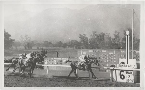 For a country weighed down by the Great Depression, Seabiscuit was an inspiration. After suffering potentially career-ending injury training for the "Hundred-Grander" at Santa Anita in 1939, the race horse showed his heart and won the elusive event just a year later. This historic image from March 2nd of 1940 shows Seabiscuit as he crossed the finish line at the famous Santa Anita Handicap with jockey Red Pollard astride. Measuring 7 x 11", the vintage news service photo is EX-MT with original caption sheet affixed to verso.