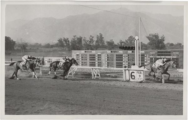 In recent years, America has rediscovered its love affair with Seabiscuit. The indomitable racehorse had a spirit that captured the public's attention like no other. Here is a great image from the finish line of the 1937 Huntington Beach Classic at Santa Anita, showing Seabiscuit winning handily. Vintage image is EX-MT and measures 7x11" with original caption sheet affixed to verso.