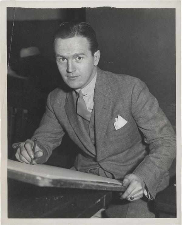 King Features Syndicate is responsible for this 1940 press photo of one of their top talents: Flash Gordon cartoonist Alex Raymond. Raymond, impeccably dressed, is posed at his easel in this 8x10", EX image.
