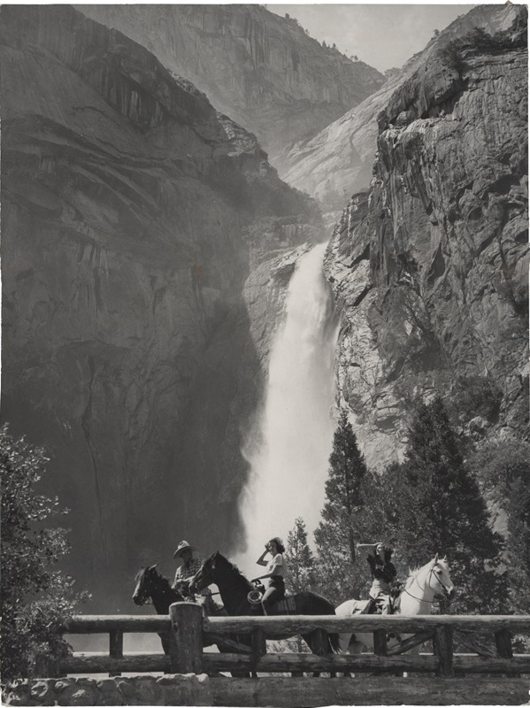 The lens of Ansel Adams captured the American landscape as none before and there is no better example of Adams' brilliant view of the American West than his photographs of Yosemite. Here is an original Ansel Adams photograph from 1960. This vintage image, a stunning view of Lower Yosemite Falls with sight-seers on horseback in the foreground, is a National Park Service press release from the archives of the San Francisco Examiner. The verso has a photographer's stamp that says, "Photographed in Yosemite by Ansel Adams". The 7 ? " x 9 ?" & EX+ photo will be spectacular in a frame