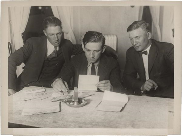 Amazing image from 1922 shows Swede Risberg and Hap Felsch, infamous for their involvement in the Black Sox scandal, filing suit against president Comiskey for back salary & alleging the higher-ups in baseball long knew of "crookedness" is baseball. Measures 6.5 x 8.5" and in EX/NM condition. Original caption sheet affixed to verso.