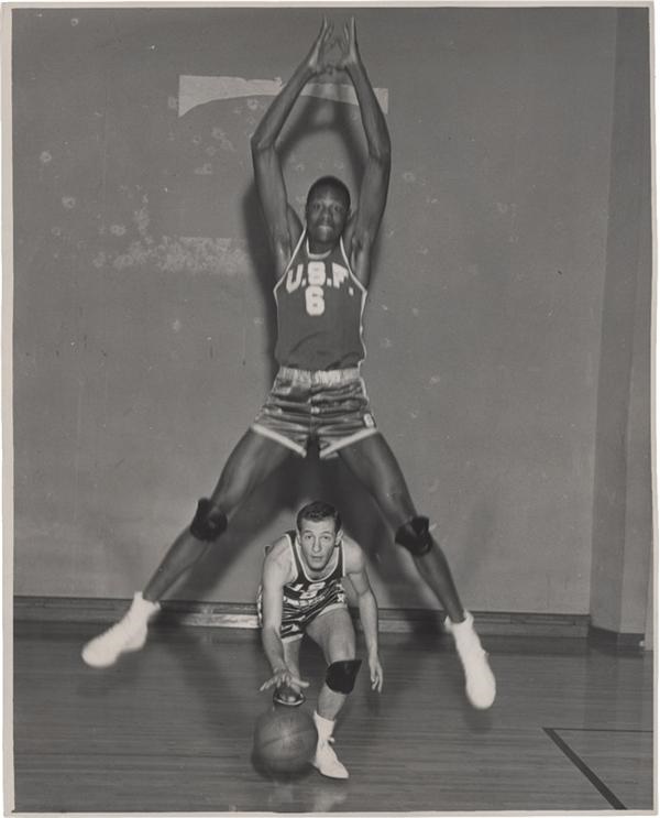 Basketball great, Bill Russell, before he became an NBA and Boston Celtics legend. (2) Photos from the 1950's capture Russell hamming it up with USF teammate Rudy Zannini in 1953 (EX) and beaming with his new bride in 1959- not long after winning Olympic gold in Melbourne (NM with caption sheet affixed to verso). Photos are both 8x10". ;