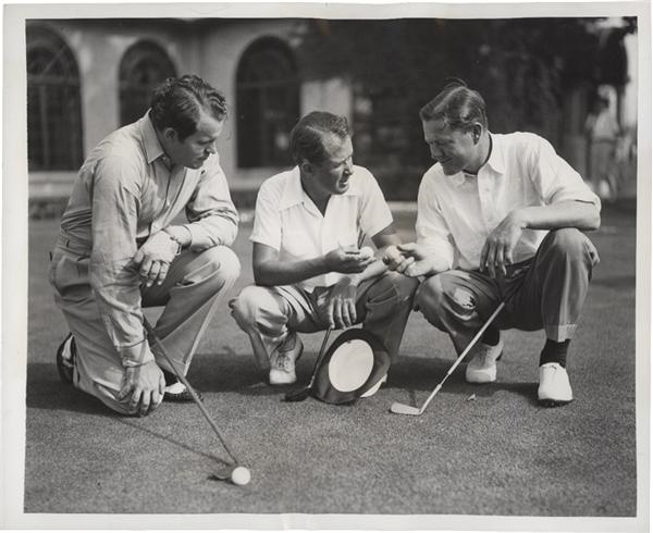 Ralph Guldahl was, for a handful of years in the mid to late 1930's, one of the best golfers in the world. He did not win again after 1940 and retired from tournament golf. Here are (2) fine images of Guldahl from the twilight of those golden years alongside the legendary Byron Nelson including: A pow wow on the green at Pomonok CC just before the PGA championship in 1939 (NM+ with original caption sheet affixed to verso); A serious locker room conference with Nelson in 1941(NM+). Both measure 8x10.