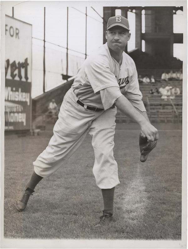 A complicated man and tough competitor, Hugh Casey was a stellar relief pitcher for the Dodgers during the 1940's, as well as a cohort of Ernest Hemingway. Sadly, he took his own life in 1951. Here are three, high quality Hugh Casey wire and news service photos from his time with the Dodgers. Two date from October 1941 reporting on the World Series match-up against the Yanks, including one with catcher Mickey Owen who lost a grip on Casey's final strike and set the Yanks on their way to a game winning rally in game 4. The third photo shows Casey sitting dejectedly in front of his locker following another WS loss (this time in 1947) against the Yankees. All photos are strong NM/MT and measure 6.5 x 8.5" to 7.5 x 10" Brooklyn Dodgers Photos (3)